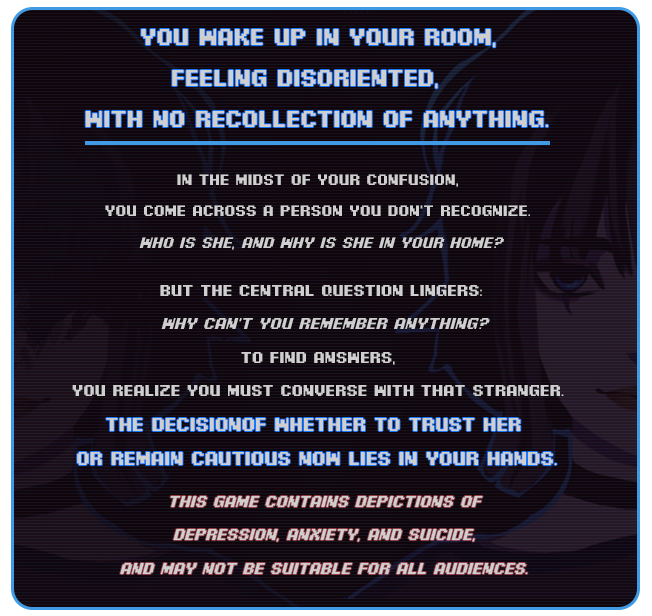 I will just say, that this game is very deep. It hit home to me pretty harshly, and I know one thing... I got to take those disclaimers seriously lol. In seriousness though, this game is beyond fantastic, and I am anticipating for the full release of this game. Thank you for this amazing game. That "diary" section is something you can't forget.